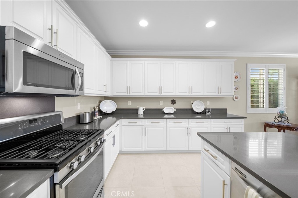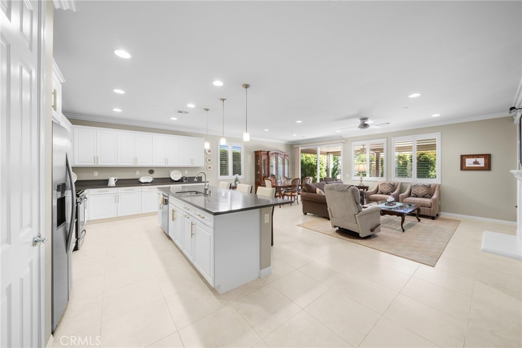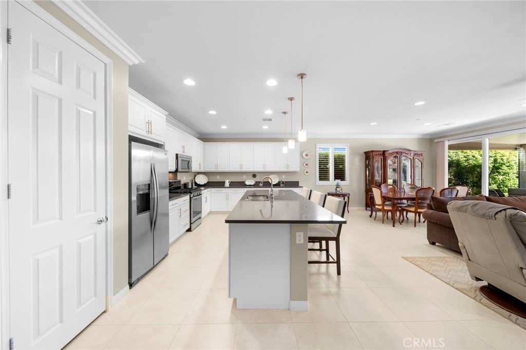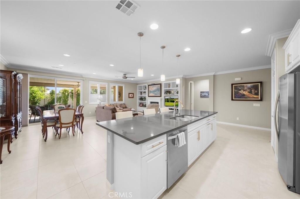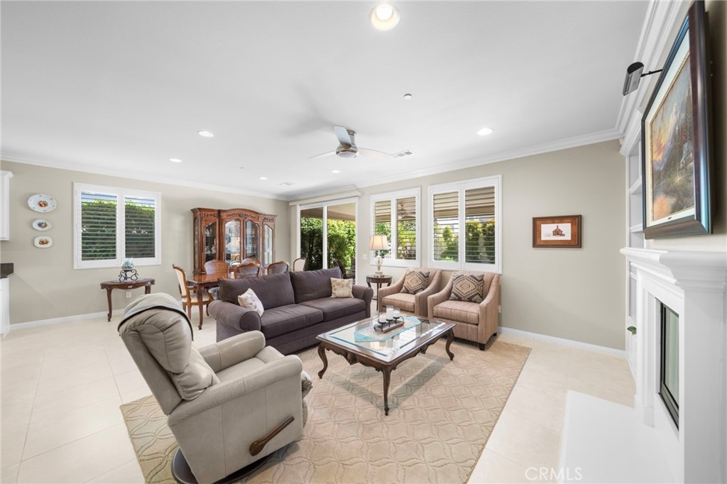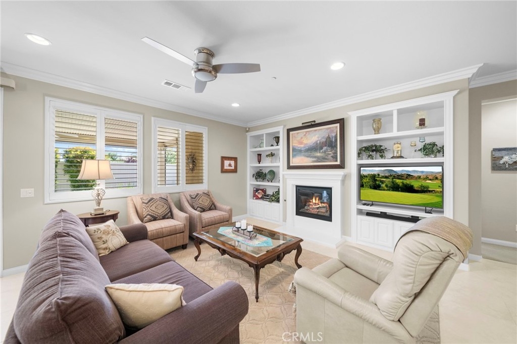 Welcome to Roripaugh Ranch — where luxury living meets everyday comfort. Located in this highly sought-after gated community, this beautifully upgraded single-story home offers an open floorplan designed for effortless living and entertaining. At the heart of the home is a spacious kitchen featuring a large central island, quartz countertops, stainless steel appliances, and crisp white cabinetry. The kitchen flows seamlessly into the dining area and family room, which boasts a cozy gas fireplace, custom built-ins, crown molding, and plantation shutters.