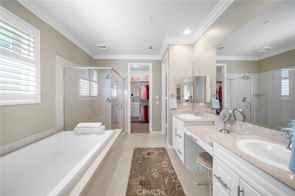The primary suite is a true retreat, offering dual vanities, an oversized soaking tub, walk-in shower, and two separate walk-in closets. Two additional bedrooms share a full bathroom, while a separate powder room is ideal for guests. The oversized 2.5-car garage provides ample room for both vehicles and extra storage.