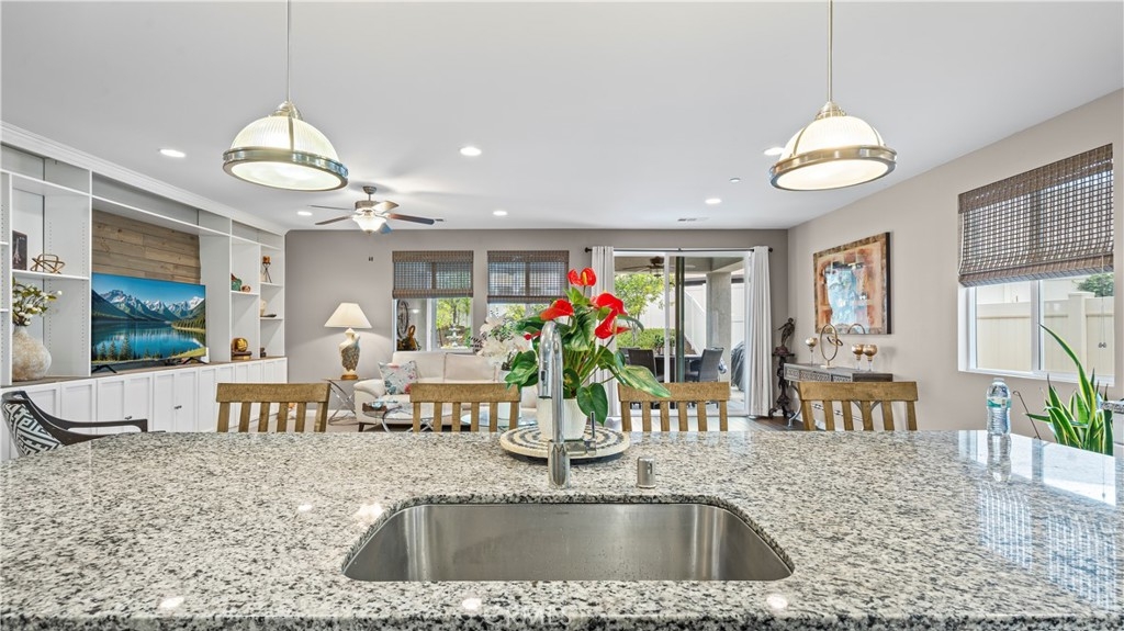 Price Adjustment! Single-story home on an expansive 10,000+ sq ft lot in the highly desirable Roripaugh Ranch community of Temecula, featuring solar to be paid off at close of escrow for added value and energy savings. Designed with an open-concept layout, the home offers high ceilings and abundant windows that fill the space with natural light. The gourmet kitchen is both stylish and functional, featuring stainless steel appliances, granite countertops, an oversized center island, white shaker cabinetry, and a walk-in pantry. It flows seamlessly into a spacious great room with a custom built-in entertainment center and a large dining area—ideal for everyday living and entertaining. A versatile bonus room provides flexibility for a formal dining area, home office, or potential additional bedroom. The expansive primary suite serves as a private retreat with dual walk-in closets, a soaking tub, and a separate shower. Two additional generously sized bedrooms are tucked away along a private hallway, along with a bright laundry room. Luxury vinyl plank flooring runs throughout, offering durability and low maintenance. Additional energy-efficient features include a tankless water heater, drip irrigation, and drought-tolerant landscaping. Residents of Roripaugh Ranch enjoy resort-style amenities including a clubhouse, pool and spa, 24-hour fitness center, tennis and basketball courts, parks, and scenic walking trails. Conveniently located near top-rated schools, shopping, dining, Temecula wineries, golf courses, and easy freeway access.